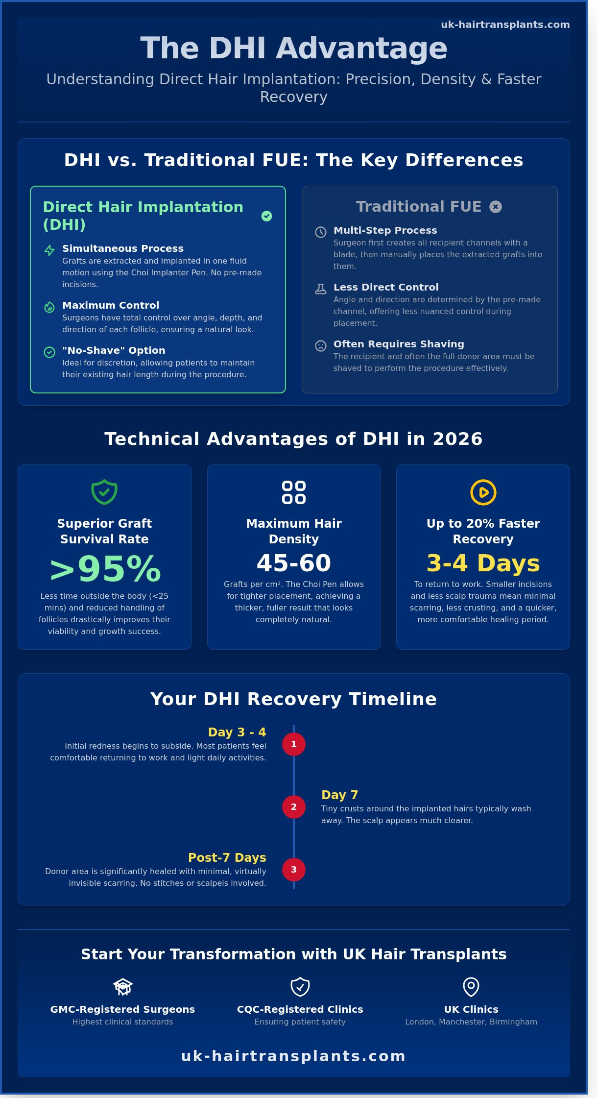 Choosing a DHI hair transplant in 2026 means opting for a procedure that prioritises both surgical precision and your personal comfort. By using specialised Choi implanter pens, our surgeons achieve graft survival rates that often exceed 90%, ensuring your investment yields the dense, natural-looking results you expect. You aren’t just choosing a treatment; you’re choosing the safety of CQC-regulated UK clinics and the expertise of GMC-registered surgeons who adhere to the strictest medical standards in the country.