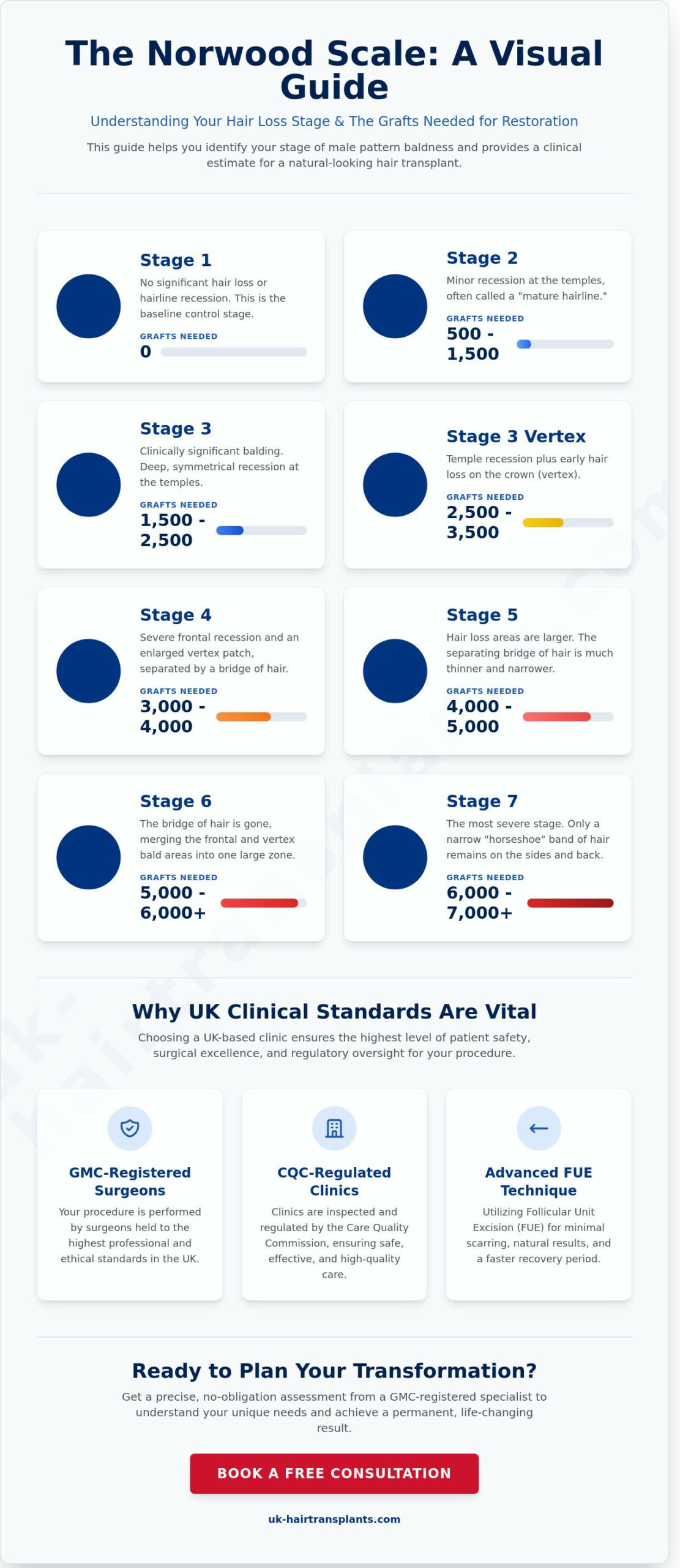 Whether you’re at Stage 2 or Stage 6, identifying your Norwood stage is the essential first step. Our GMC-registered surgeons provide the clinical authority to ensure a safe, effective procedure. We operate dedicated facilities in London, Birmingham, Manchester, Leeds, Bristol, and Leicester — bringing world-class restoration to your local area.